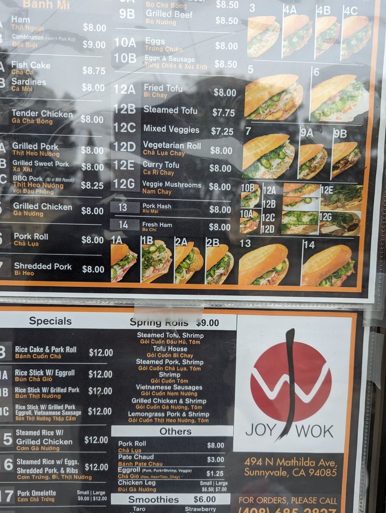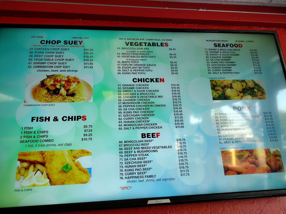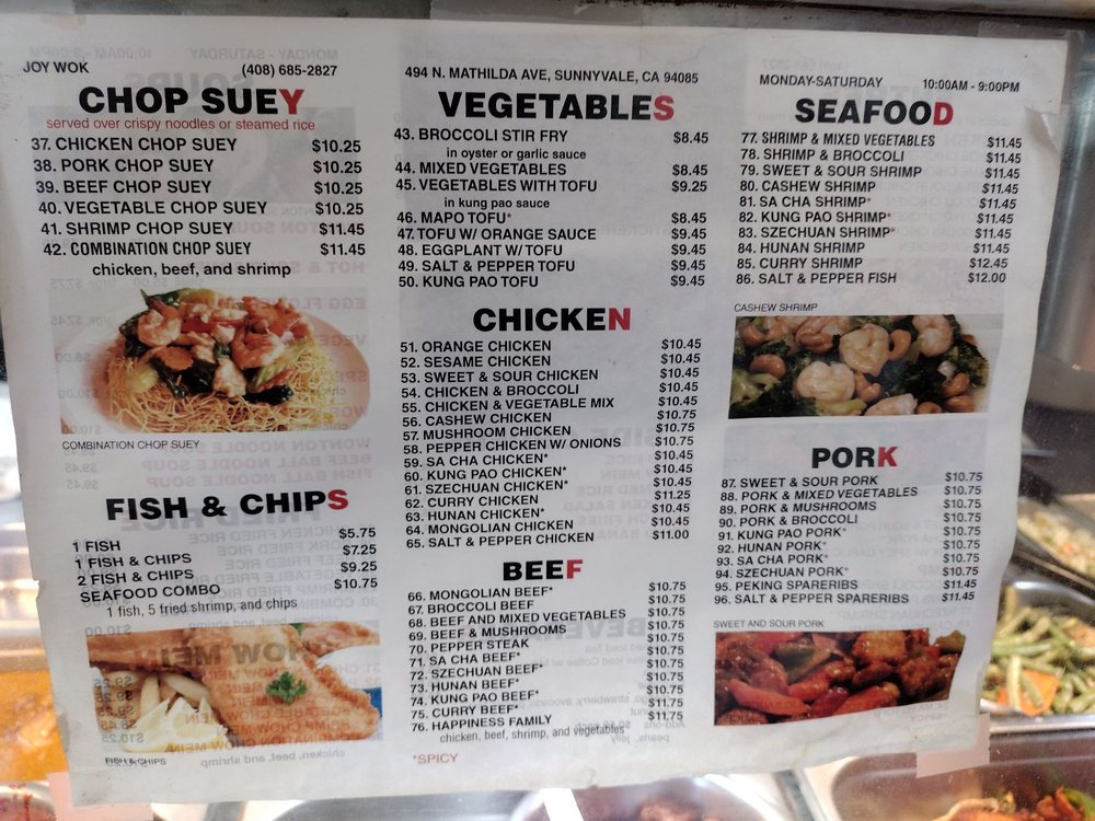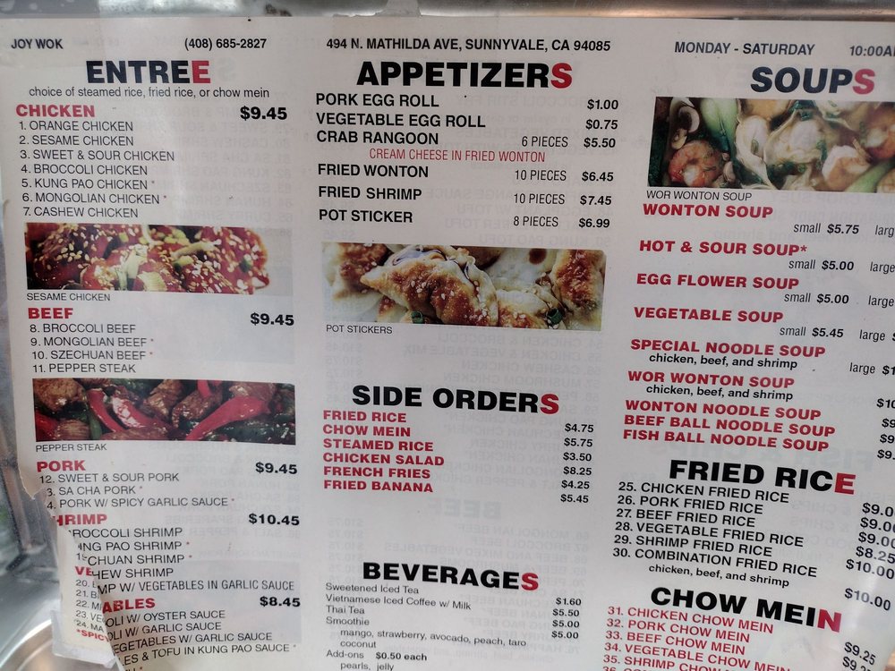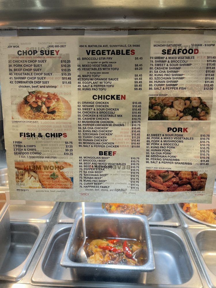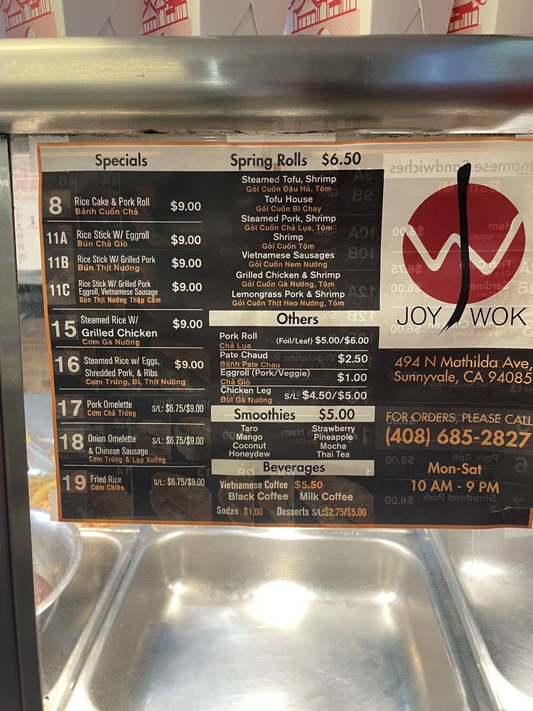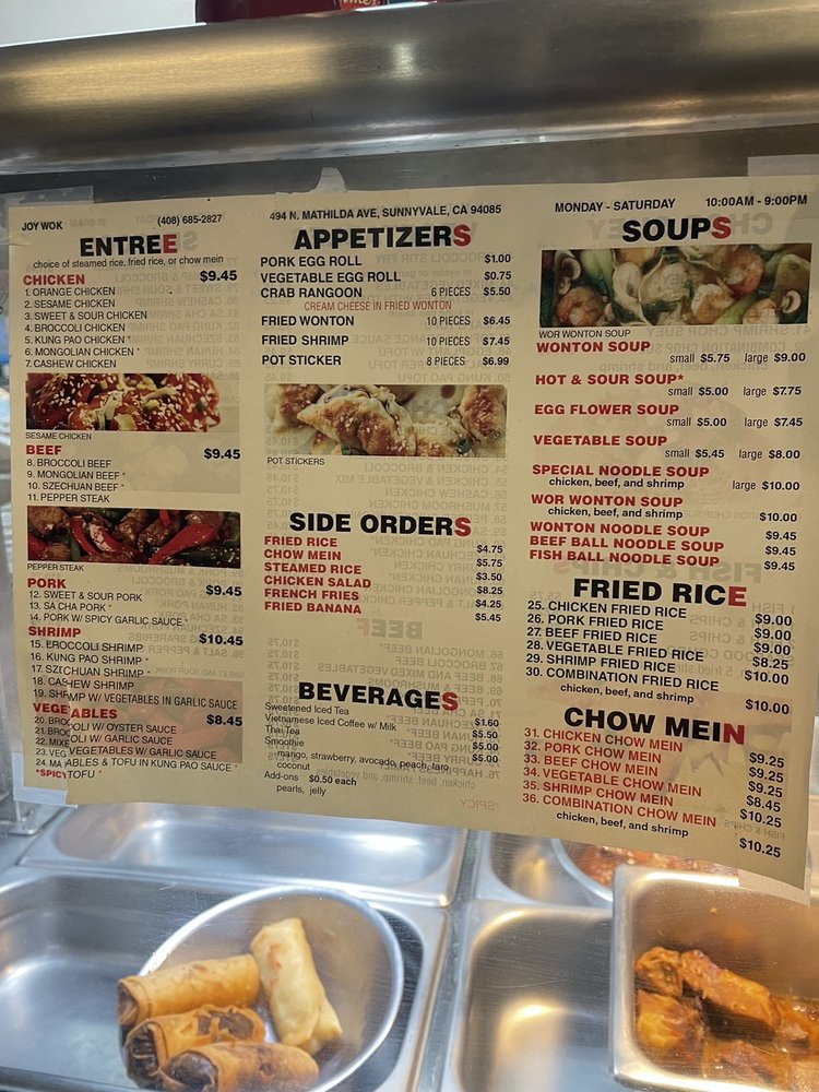 Joy Wok, located in Sunnyvale, CA, offers a variety of Chinese dishes for delivery, takeout, and dining in. The menu includes popular entrees like Orange Chicken, Sesame Chicken, and Mongolian Beef, along with appetizers such as Crab Rangoon and Fried Shrimp. Customers praise the customizable options, flavorful dishes, and generous portion sizes. Reviewers highlight the freshness and taste of the meats in dishes like the Banh Mi and combination soups. The affordable prices and friendly service make Joy Wok a go-to spot for quick and satisfying Asian cuisine. Whether you're in the mood for a comforting meal or want to explore new flavors, Joy Wok has something for everyone to enjoy.